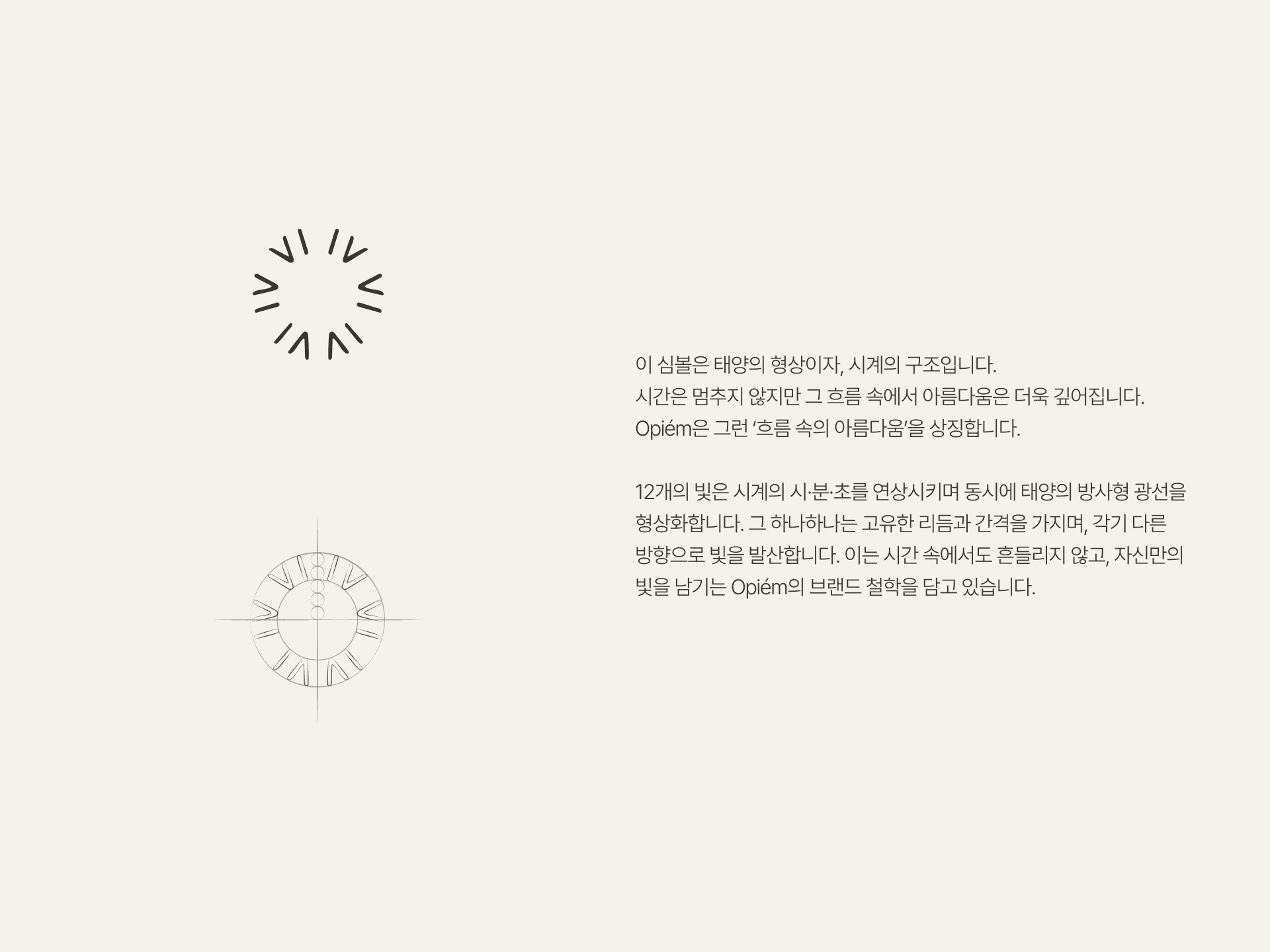 오피엠(Opiém)의 전체적인 브랜드 디자인은 시간을 거스르기보다 그 흐름을 자연스러운 과정으로 받아들이는 ‘Well-Aging Beauty’의 가치를 시각적 언어로 치환하는 작업이었습니다. ‘흐름 속의 아름다움’을 핵심 키워드로 설정하여, 바쁜 도시의 소음 속에서도 고요하고 깊은 여운을 남기는 브랜드의 진정성을 정제된 감도로 구현했습니다.